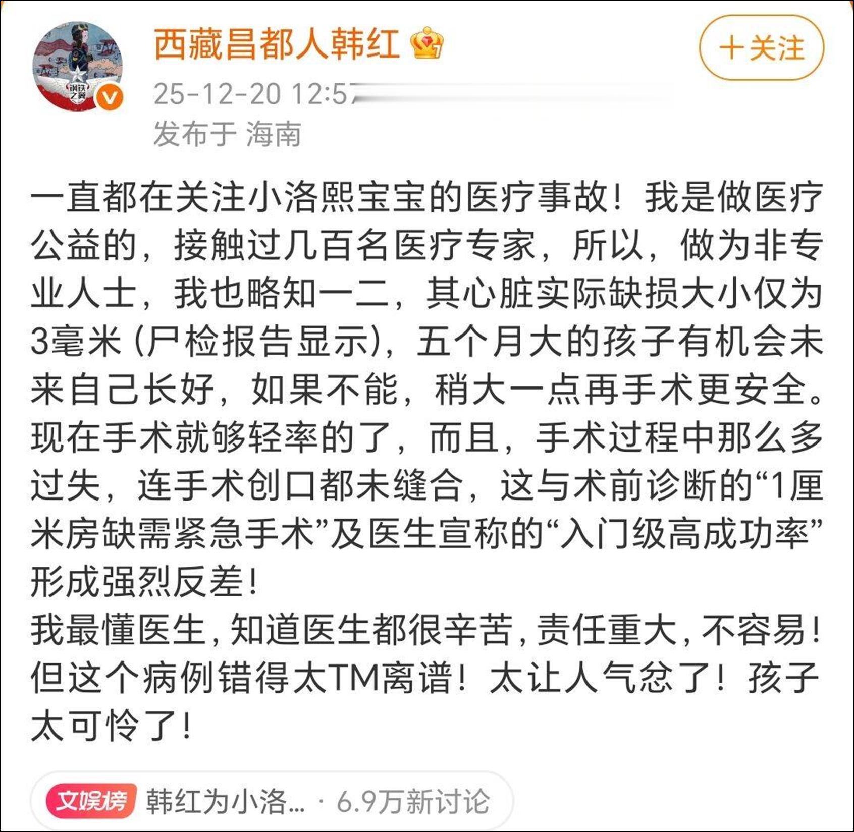 一直关注此事的韩红也忍不住发声,作为深耕医疗公益的从业者,她直言这个病例错得太离谱:“五个月大的孩子有机会自己长好,就算不能,稍大一点手术也更安全,术前诊断与实际情况的反差,加上术中诸多过失,实在太让人气愤,孩子太可怜了。”