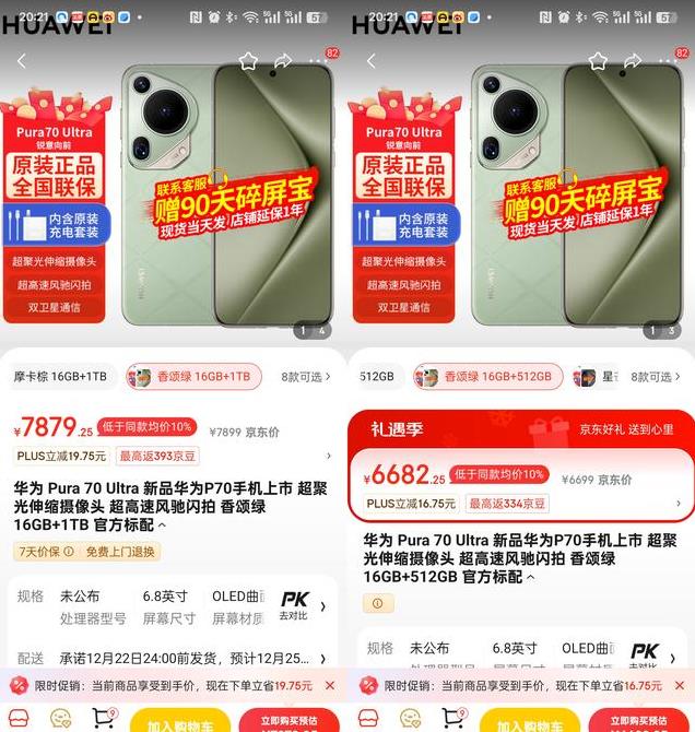 以华为Pura70Ultra的16G+512G版本为例,原本售价9999元,优惠1200元之后价格为8799元。
