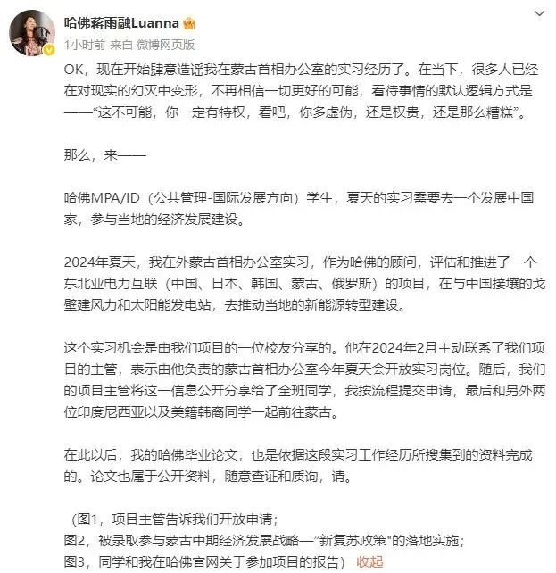 尽管蒋雨融后来澄清“推荐信未提交”“父亲未干预录取”,但网友仍质疑: