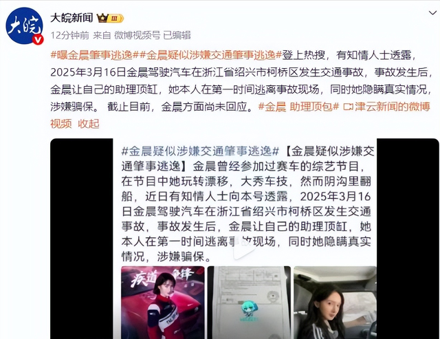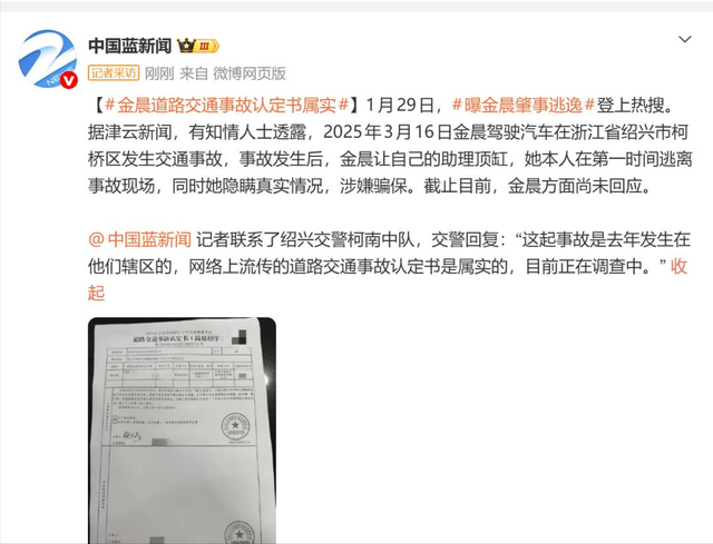 2026年1月29日,有知情人士在社交平台披露,演员金晨2025年3月16日在浙江省绍兴市柯桥区发生交通事故。爆料称,事故发生后,金晨并未留在现场,而是与经纪人迅速离开,留下助理徐长青处理后续事宜。