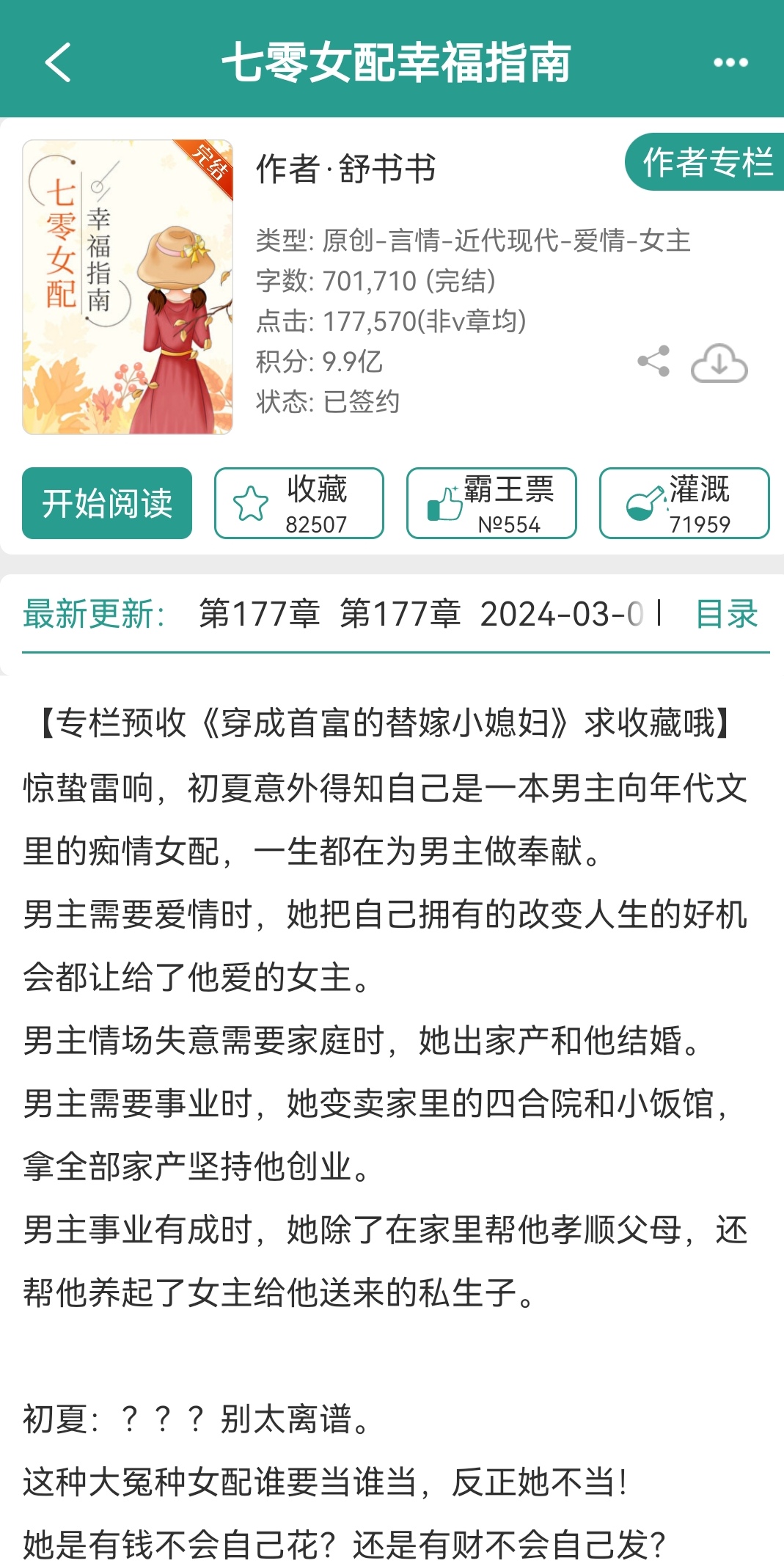 开篇女主初夏被雷劈到觉醒,发现自己是一本书里的女配,为书里男主奉献一生。清醒过来的初夏决心远离原男主,于是开始抗争,改变重要剧情,扭转自己的命运。男主林霄函,毒舌傲娇,利己主义者,在书里是一个反派,和女主是一起下乡的知青。初夏跟随原男主下乡,受剧情影响做了很多讨好他的事,所以林霄函觉得她很蠢。