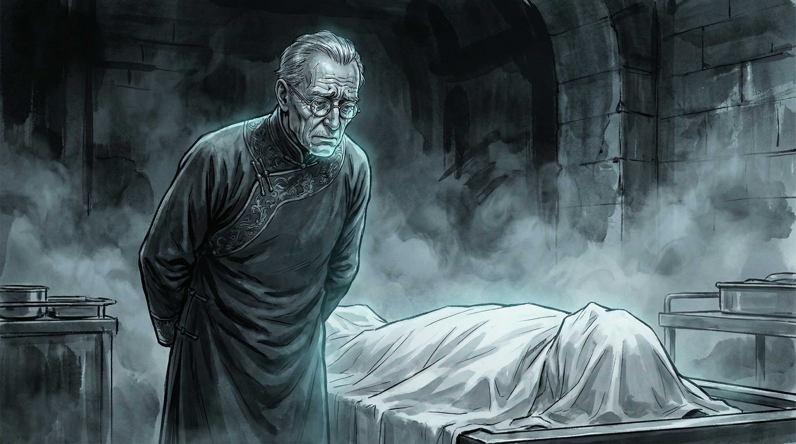 悲痛的倭讷在昏暗的停尸房内查验女儿伤口