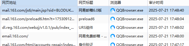 网站浏览:记录访问的URL、标题、停留时间,标记高风险网站(如招聘平台、网盘)。