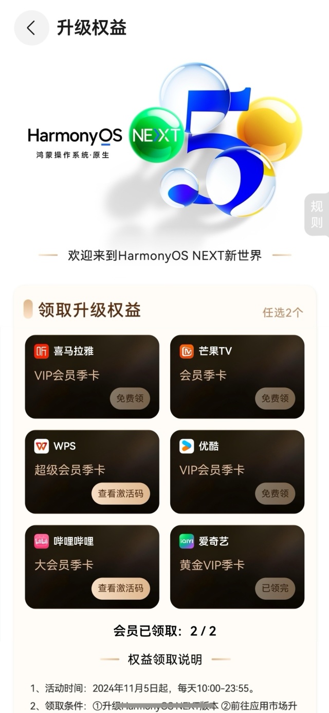 悄悄告诉你,如果你已经升级到了HarmonyOS NEXT,那么还有额外福利等着你!从11月5日起,每天上午10点,只需在华为手机桌面右划进入负一屏,点击“升级权益”,就能免费领取各大应用的会员季卡,包括但不限于喜马拉雅、爱奇艺等,让你的生活更加丰富多彩。此外,使用“我的华为”App还可以领取华为自家应用的各种会员服务,比如华为视频、华为阅读等,满足你在影音娱乐、阅读等方面的多方面需求;还有华为云空间60天备份空间和华为天际通6份一日行境外流量套餐,在生产力方面也能帮上大忙。
