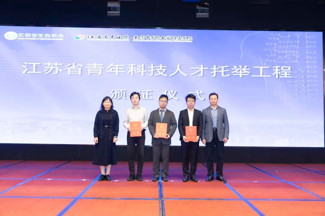 由江苏省科协学会学术部部长岳智顺、江苏省卫生健康委中医综合处一级调研员陈燕为江苏省青年科技人才托举工程资助对象徐天成、陆梦江、鲁海进行颁奖。