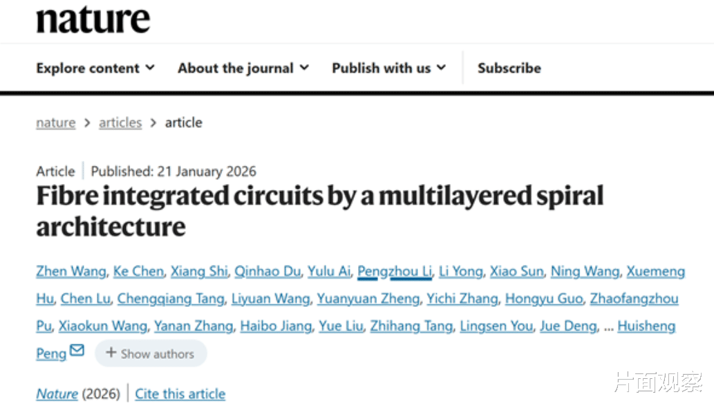 近日,据复旦大学公众号介绍,今天凌晨,国际顶级学术期刊《自然》主刊发表了复旦大学彭慧胜/陈培宁团队的最新研究成果《基于多层旋叠架构的纤维集成电路》,团队成功在柔软的高分子纤维内制造出大规模集成电路,创造出世界首款“纤维芯片”。