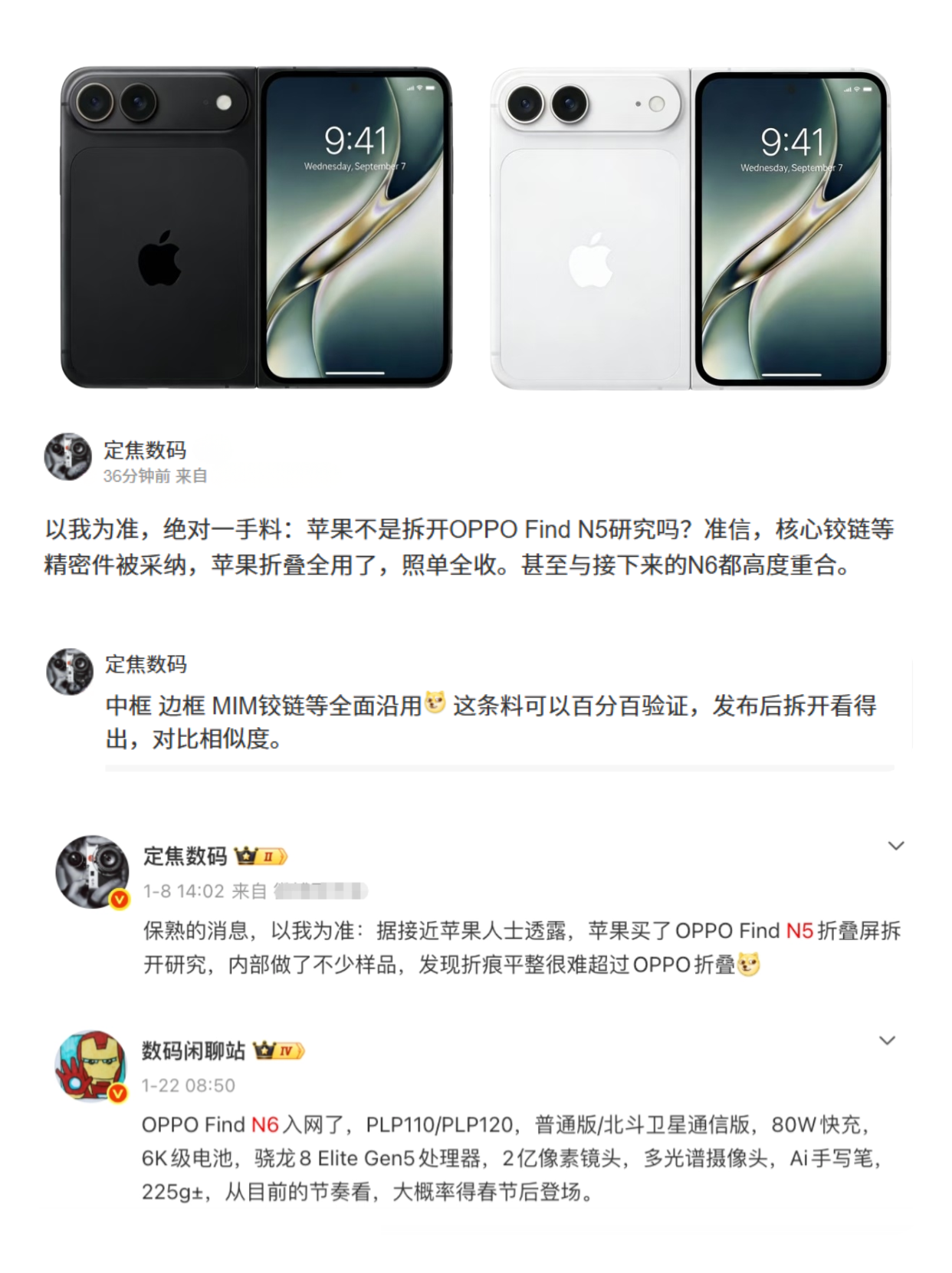 不过比较尴尬的局面也有,苹果折叠主打卖点可能由Find N5率先发布~有博主爆料称苹果曾拆解Find N5研究其精密件,并且苹果折叠可能会和Find N6技术路线极为相似~