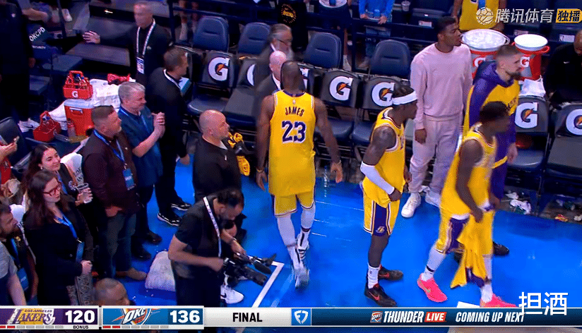 比赛结束,老詹从场边转身,直接走向球员通道,退场了,今天输球心情沮丧,老詹没有兴趣和雷霆球员赛后拥抱致意。
