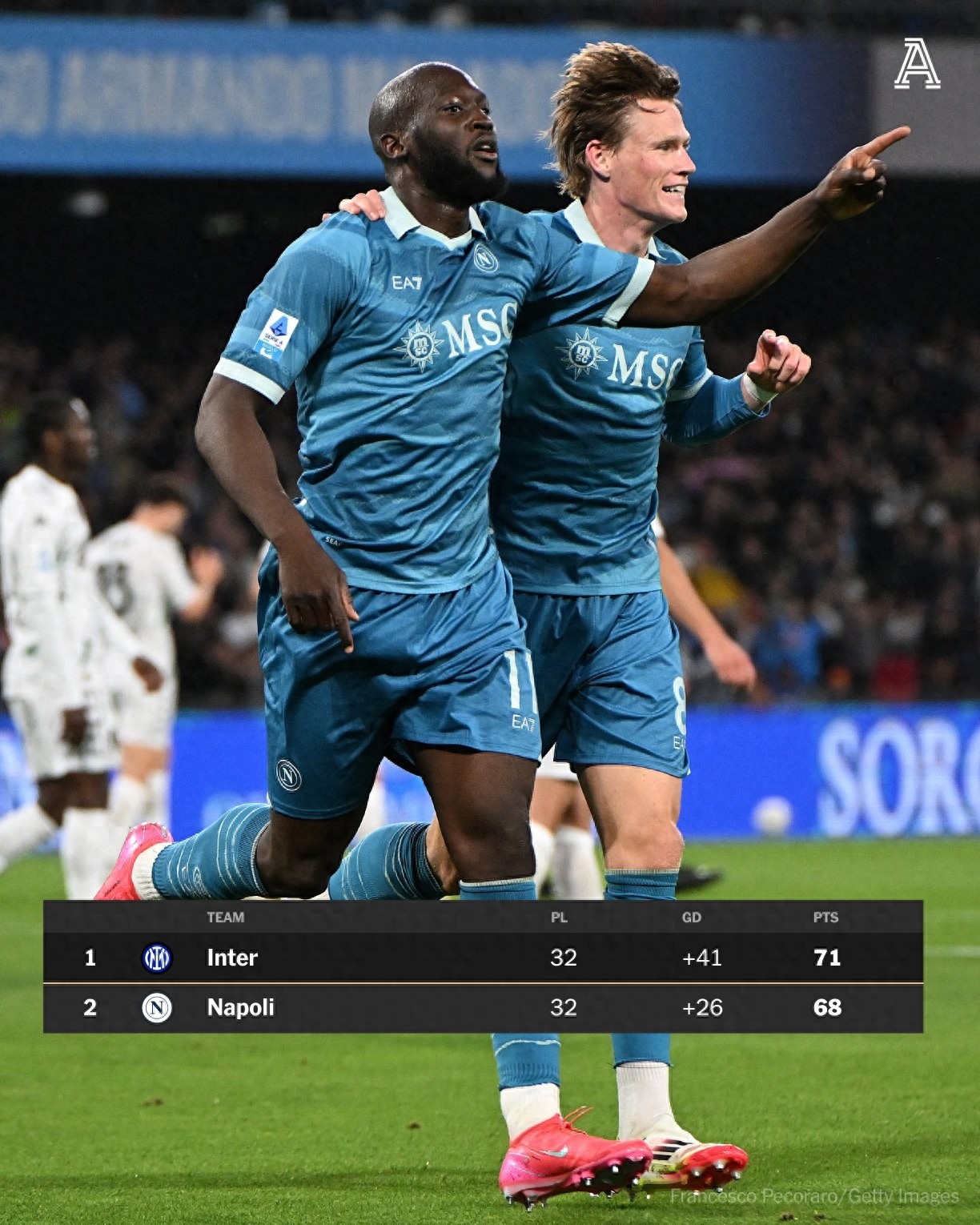 意甲第32轮最后一轮,那不勒斯凭借着两大英超旧将卢卡库的2传1射以及麦克托米奈的梅开二度,主场3-0完胜恩波利,联赛6轮不败,以3分之差紧追榜首国际米兰。