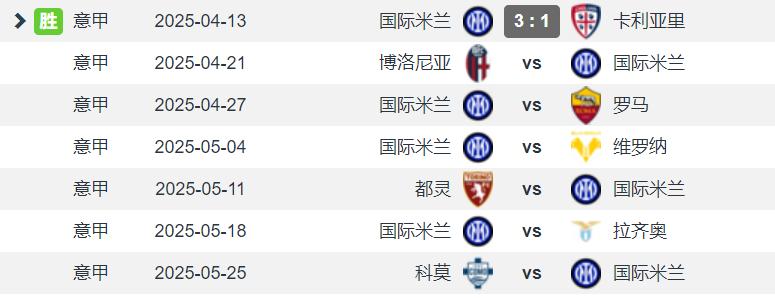 国际米兰本赛季意甲最后6轮对手:客战博洛尼亚、主战罗马、主战维罗纳、客战都灵、主战拉齐奥、客战科莫。
