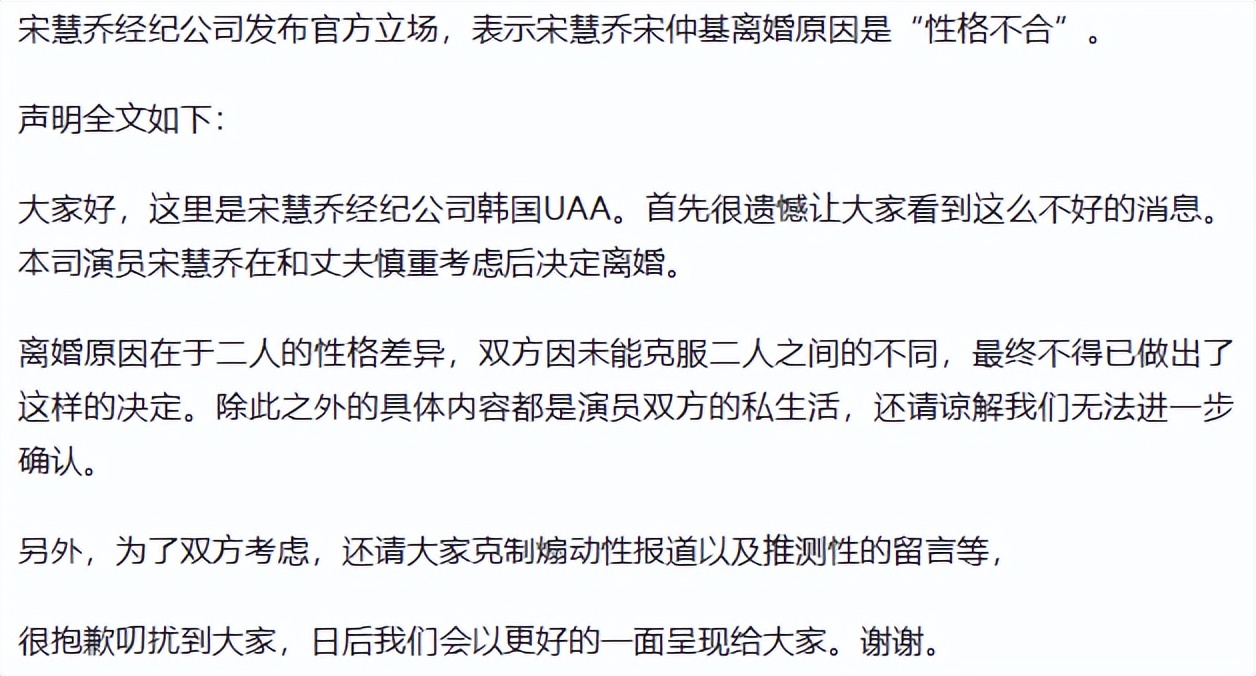 不仅如此,在两人离婚调解时,男方律师的那番“主要事由在宋慧乔一方”也吸引了大众关注。