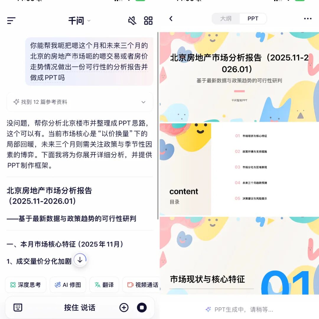 目前,背靠大模型,千问已经展现出一定的办事能力。比如,一句指令就能让千问APP几秒钟完成一份研究报告,并制作成几十页的精美PPT。