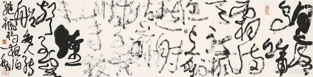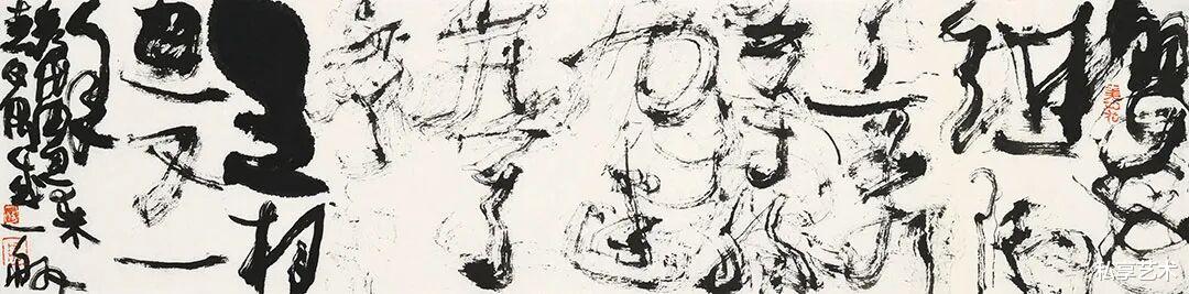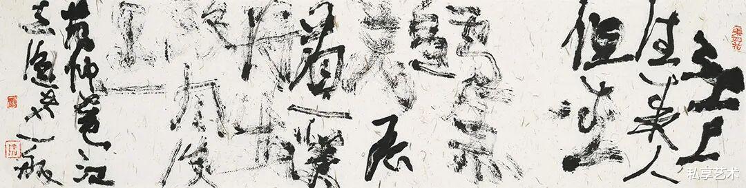 Your works clearly inherit the spirit of masters of wild cursive such as Zhang Xu and Huai Su. The frenzy and passion of"suddenly crying out three or five times,writing ten thousand words across the wall" are fully recreated in your brush. Yet you do not stop here: you push the lyricism of wild cursive to its extreme, even dissolving the readability of characters,making emotional release the sole protagonist.