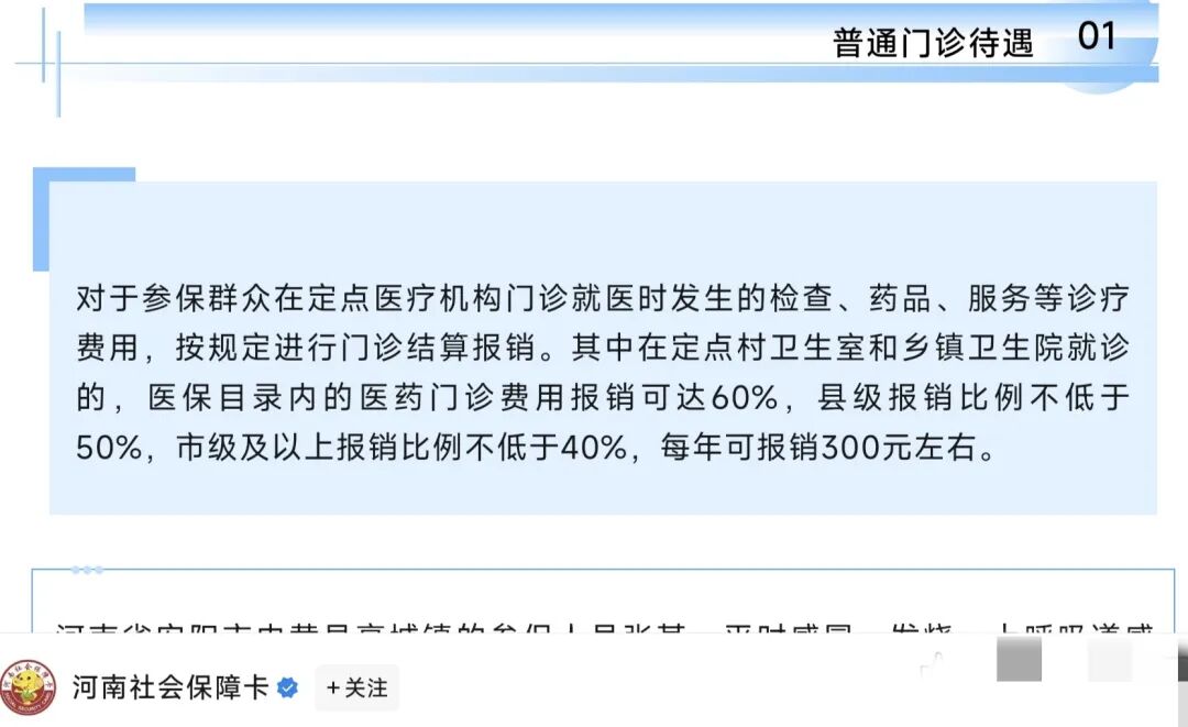 譬如,河南安阳市某镇的参保人员张大爷,感冒发烧喉咙发炎等,需要买药,抽血、检查等,到定点卫生院就诊,可享受门诊统筹报销,且没有起付标准,2025年度内享受5次门诊统筹报销,累计总费用592.6元,报销343.11元。