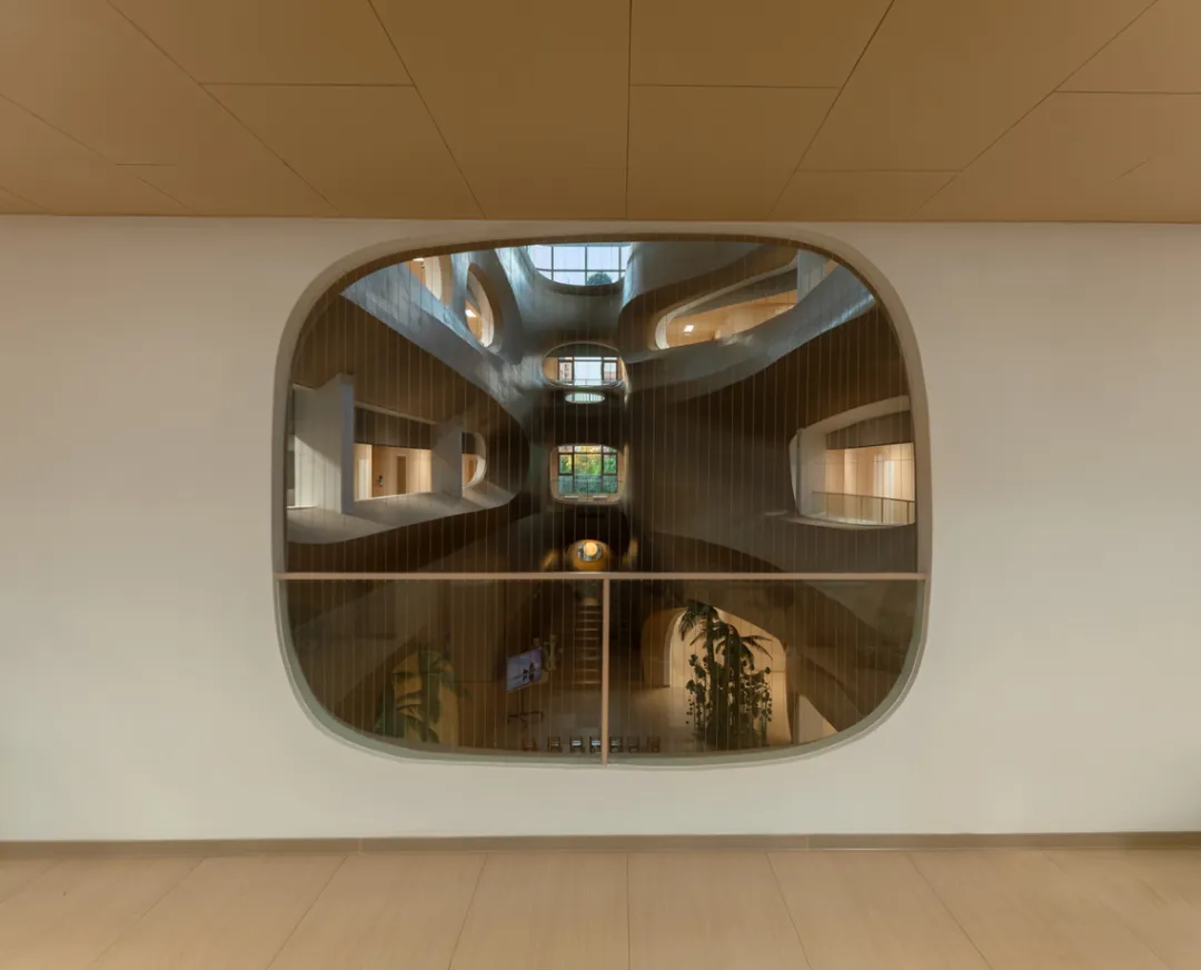 这个幼儿园的中庭形态很有特点。不同于其他案例或圆或方的穹顶轮廓,它更加不规则,看起来像一个巨大的树洞。小朋友们位于建筑内部,就像置身大树身体里,从内而外观察世界。奇妙的视觉差异,给孩子们的想象力插上了丰满的翅膀。