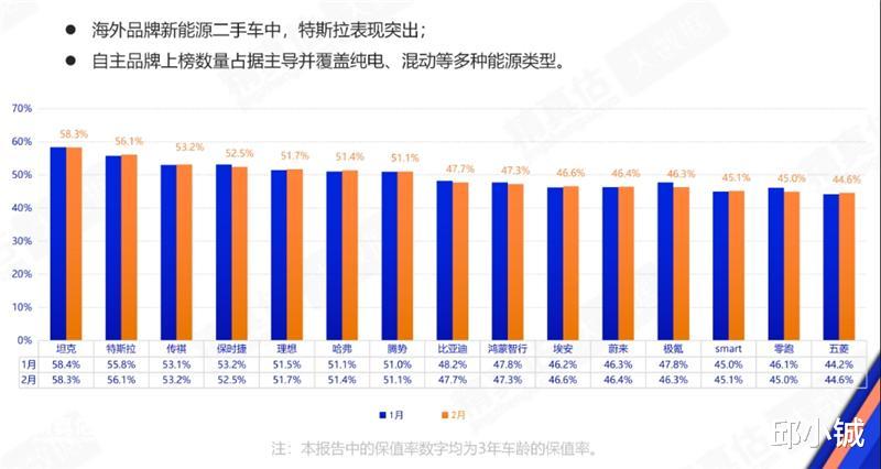 即便是放眼整个新能源市场,包括纯电、混动等车型整体来看,特斯拉品牌的新能源车三年保值率,也是十分领先的。从图表中今年1月和2月的保值率数据我们能够看到,坦克排第一,特斯拉第二。坦克品牌新能源车以混动为主,并且主要定位硬派越野SUV市场,有特殊保值属性,而特斯拉的Model 3、Model Y,则是妥妥的常规家用车型,因此这同样印证了特斯拉在主流家用市场的保值冠军地位。