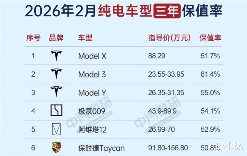 最近中国汽车流通协会与精真估联合发布《2026年2月中国汽车保值率研究报告》,数据显示纯电车型三年保值率排名前三的选手分别是特斯拉Model X、Model 3和Model Y,三年保值率分别为61.7%、61.4%和55%。排在其后的车型有极氪009、阿维塔12、保时捷Taycan、荣威iMAX8、腾势D9、比亚迪海鸥等,再往后的车型三年保值率不足50%。