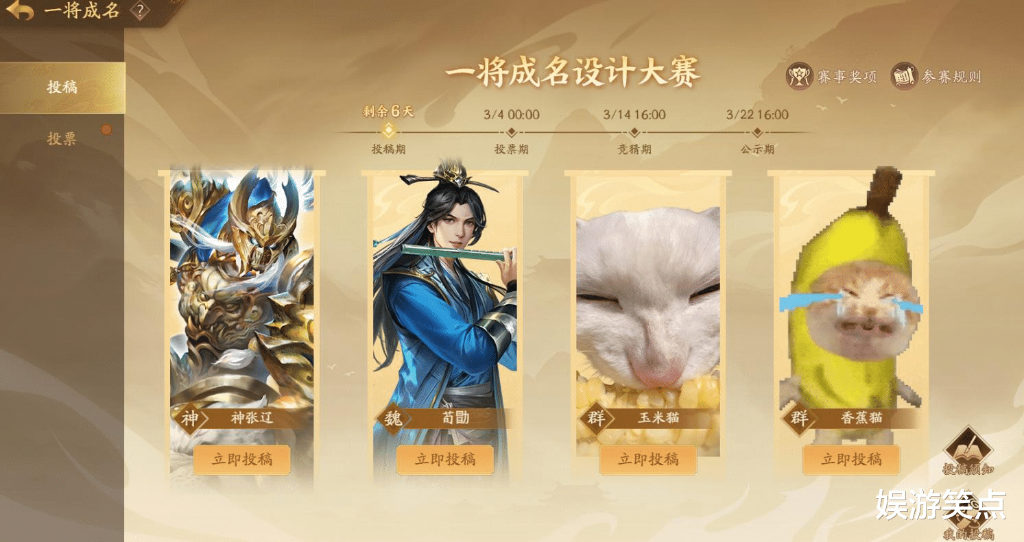 同时,《三国杀:一将成名》经典的“一将成名设计大赛”再度开启,本次大赛的命题涵盖了【神张辽】、西晋文臣【荀勖】以及猫meme界的顶流双子星【玉米猫】和【香蕉猫】,兼顾颜值与趣味,将有玩家来尽情发挥自己的创意。大赛投稿截止时间为3月3日23:59,如果你有兴趣一起共创武将,就赶紧前去参与吧!