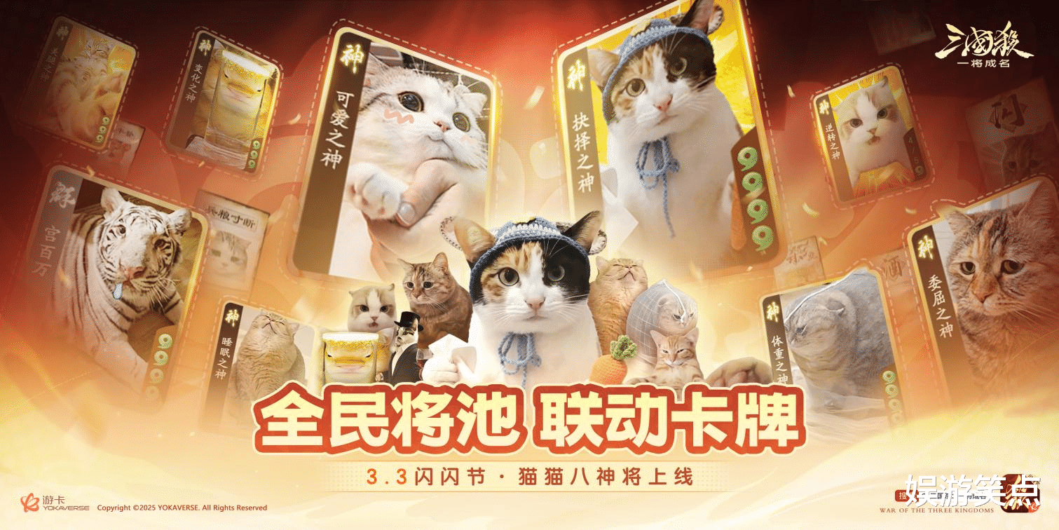 更值得一提的是,《三国杀:一将成名》还在本次“喵喵杀”活动中新增了8位喵神将,加上“猫界”明星“宫百万”,打造出了“8+1”的豪华喵系武将矩阵,每一位武将都自带专属技能与萌系人设,颜值与实力双在线。