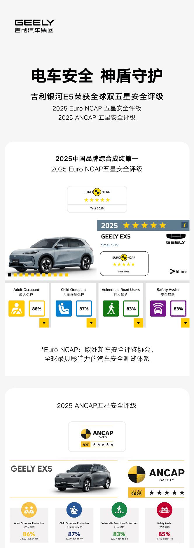在討論数據的時候,我們不能忽視的是北美交通安全管理局和欧洲新车评估计划(Euro NCAP)等权威机构的认证结果。银河E5在全球双五星认证中的表现也相当亮眼。在Euro NCAP的评分中,成人保护得分高达86%,儿童保护87%,行人保护83%,安全辅助系统83%,均超越了不少同级别竞争车型,如大众ID.3等。这意味着,银河E5不只是一个“自说自话”的优秀者,它在标准化测试中也交出了令人满意的答卷。