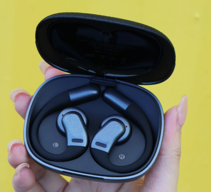佩戴体验:这款开放式耳机的耳挂的材质是液态硅胶,内嵌钛合金记忆钢丝,对耳廓的佩戴会更加贴合,就算是大幅度的运动,都是不会出现位移的,可以做到狂甩不掉