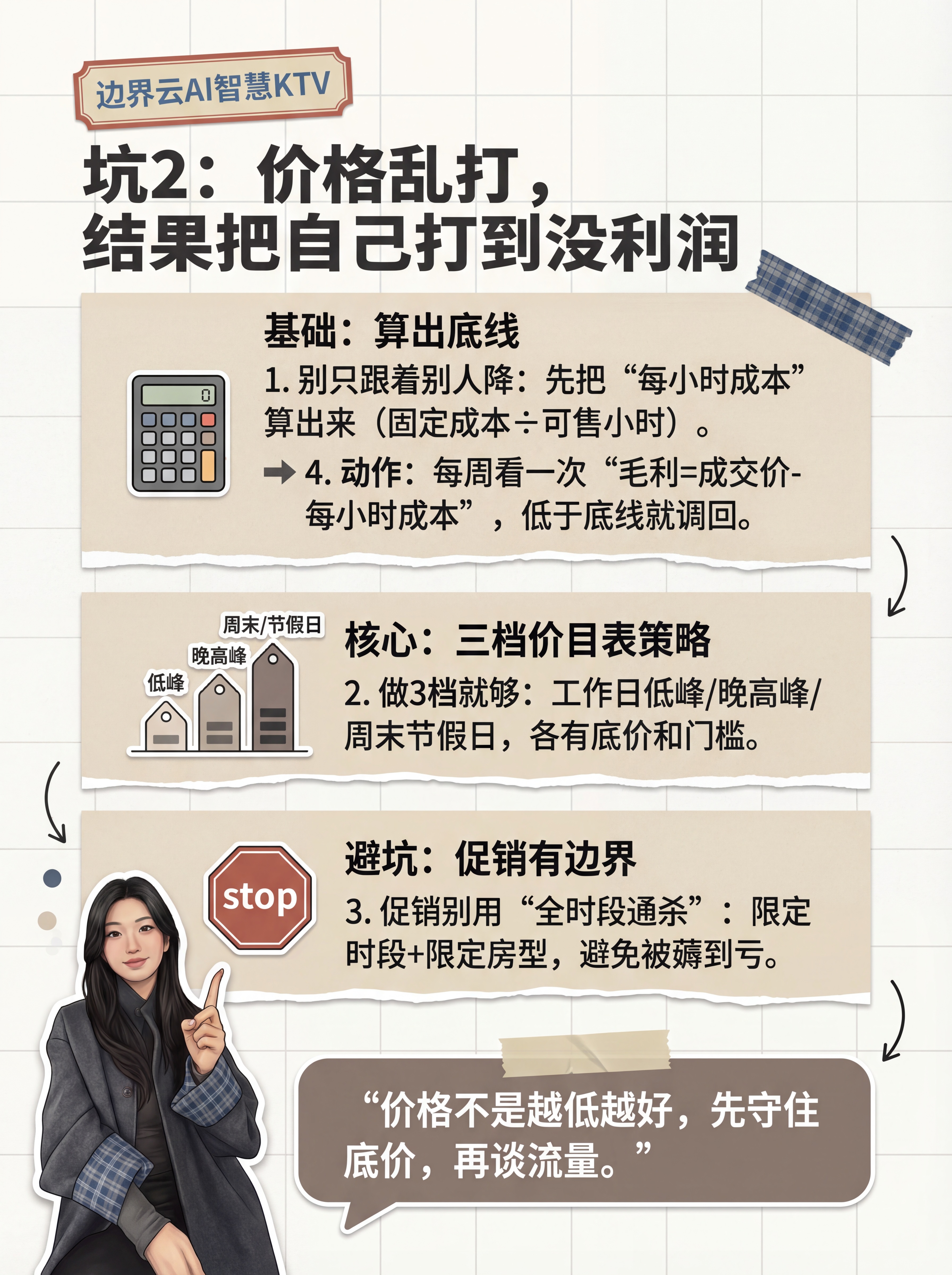 二、定价不是越低越好,守住底线才能活下来看到周围有人降价促销就跟风?千万别!先算出你每小时的硬性成本,设定价格底线。可设置工作日、晚高峰、周末三个档位的价格,促销活动也要限定时段与房型,避免全时段低价导致“有流量没利润”。