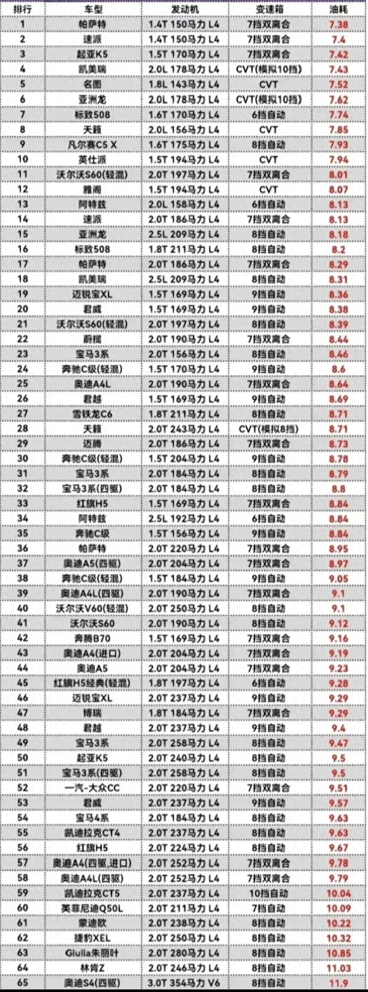 从具体数据来看,搭载1.4T发动机的帕萨特和速派以7.38升和7.4升的超低油耗分列第一、二位,紧随其后的是起亚K5,油耗为7.42升,它们共同证明了小排量涡轮增压与双离合变速箱组合的高效性。同样表现优异的还有以凯美瑞2.0L、亚洲龙2.0L为代表的日系自然吸气车型,油耗分别为7.43升和7.62升,标致508、天籁2.0L、凡尔赛C5 X等车型的油耗也均控制在8升以下。