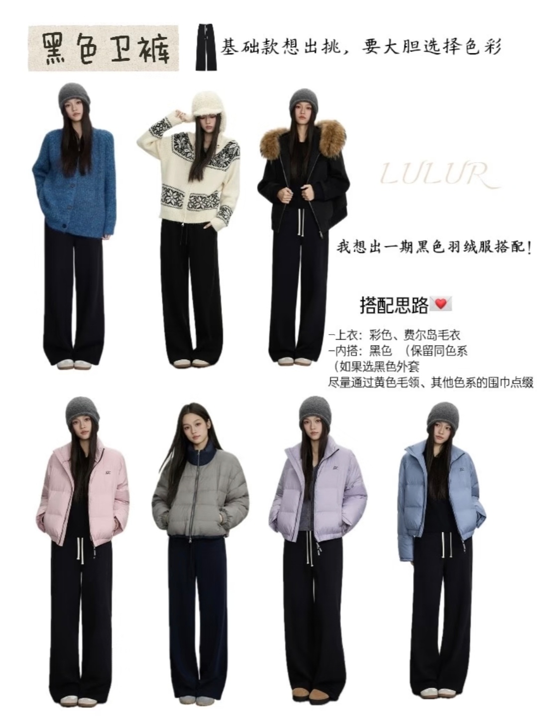 通过选择亮颜色的上衣,黑色带毛领羽绒服、粉色/灰色/紫色/蓝色短款羽绒服,搭配黑色卫裤,保暖又显高,色彩对比还能衬得肤色更亮。不费脑的基础穿搭,色差和谐,百搭不挑人,适配冬季日常出街,黑色卫裤再也不是“随便穿穿”,而是穿搭品味的低调秀场~