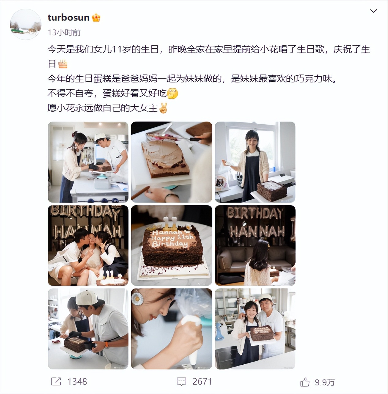 这已经是邓超孙俪连续第九年为女儿亲手制作生日蛋糕。8年前小花3岁生日时,夫妻俩为保护隐私对着女儿脸颊疯狂亲吻,那张"亲到变形"的照片曾创下12小时破亿的转发纪录。如今11岁的小花在最新合影中,面对父母左右夹击的"亲亲攻势",竟能淡定地比出"11"的手势,网友戏称:"妹妹的偶像包袱觉醒了!"