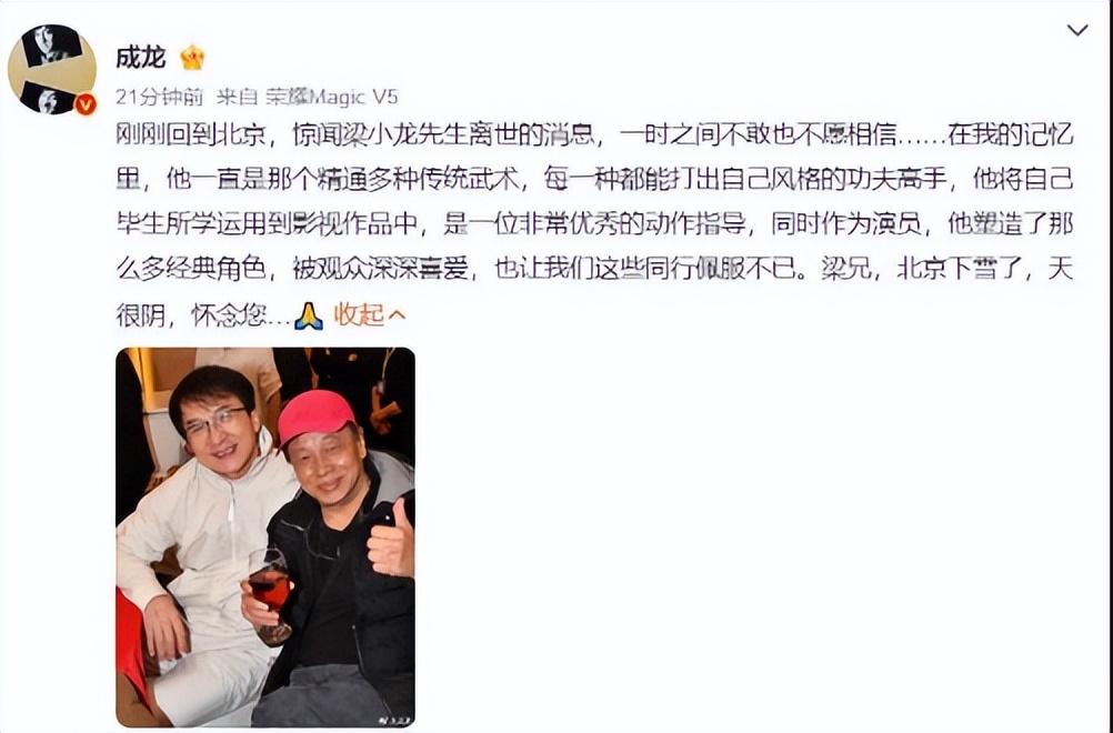 成龙喊他“梁兄”,周星驰发文“永远怀念”,李连杰直言,老朋友走了,江湖少了一面旗。
