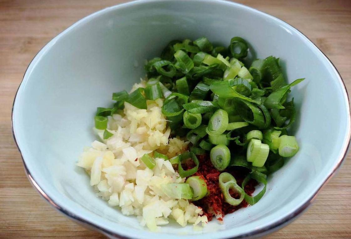 准备大葱、生姜、大蒜、剁椒,切成末后混合,再加入盐、白糖、生抽、香醋和香油。