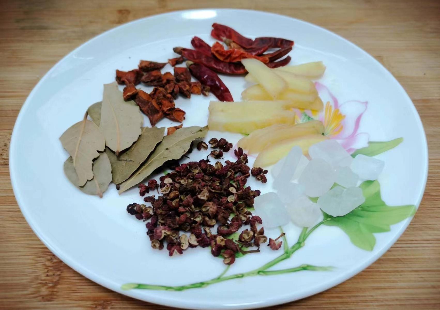 我们需要准备蒜薹、盐、八角、香叶、生姜、花椒、冰糖、干辣椒、生抽、陈醋和白醋。