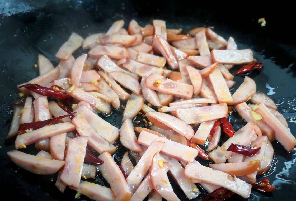 热锅中放油,炒香生姜和辣椒段,再加入火腿翻炒,最后放入芹菜段炒至断生,调入蚝油、盐、五香粉和鸡精炒匀即可。
