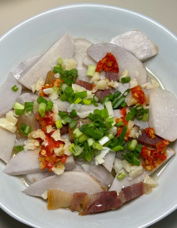 这两道菜一荤一素,一咸鲜一香辣,却同样下饭。腊肉蒸豆豉咸香醇厚,肥肉部分晶莹剔透,入口即化;瘦肉紧实有嚼劲,带着烟熏的深邃风味。剁椒芋头则辣得爽快,芋头粉糯入味,一口下去,从舌尖暖到胃里。配上热腾腾的白米饭,便是寒冬里最满足的一餐。如今外婆已老,但那口灶台边的滋味,却成了味觉里最牢固的乡愁。每当冬日来临,总会想起那混合着烟熏、咸香与鲜辣的温暖气息,那是家的味道,也是童年冬日里最踏实的安全感。