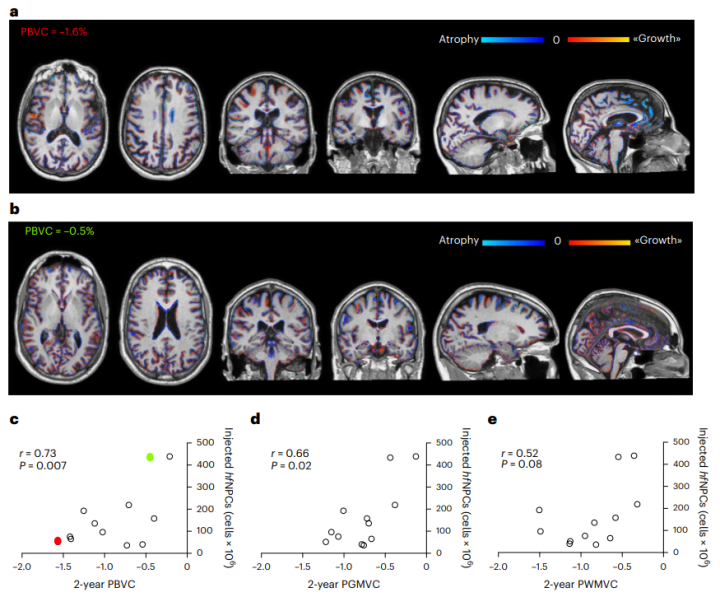 治疗两年后,每位患者又接受了核磁共振扫描,那些注射干细胞剂量最多的患者大脑灰质损失最少。