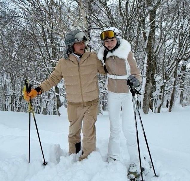 在雪地上,许晋亨还不由看向李嘉欣,那眼神仿佛在说:我老婆也太漂亮了吧!怎么看都看不腻。