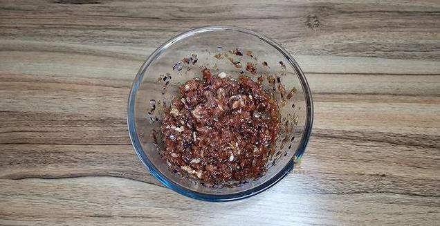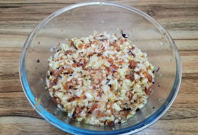 7、最后我们将白菜放到肉馅之中,用筷子扒拉几下,攥成团的白菜散开,继续搅拌,同肉馅混合均匀。再尝尝咸淡,适量补盐调整即可。