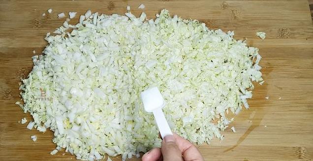 3、先将白菜沿着纵向切开,并且顺着尾部,切掉硬硬的疙瘩,然后开始切丝,再仔细地切成小颗粒。接着撒些盐,简单拌一拌,再进一步剁一剁,将比较大的块切小切碎即可。有的人喜欢用料理机,要把握好时间,不要绞得太碎,否则口感全无。