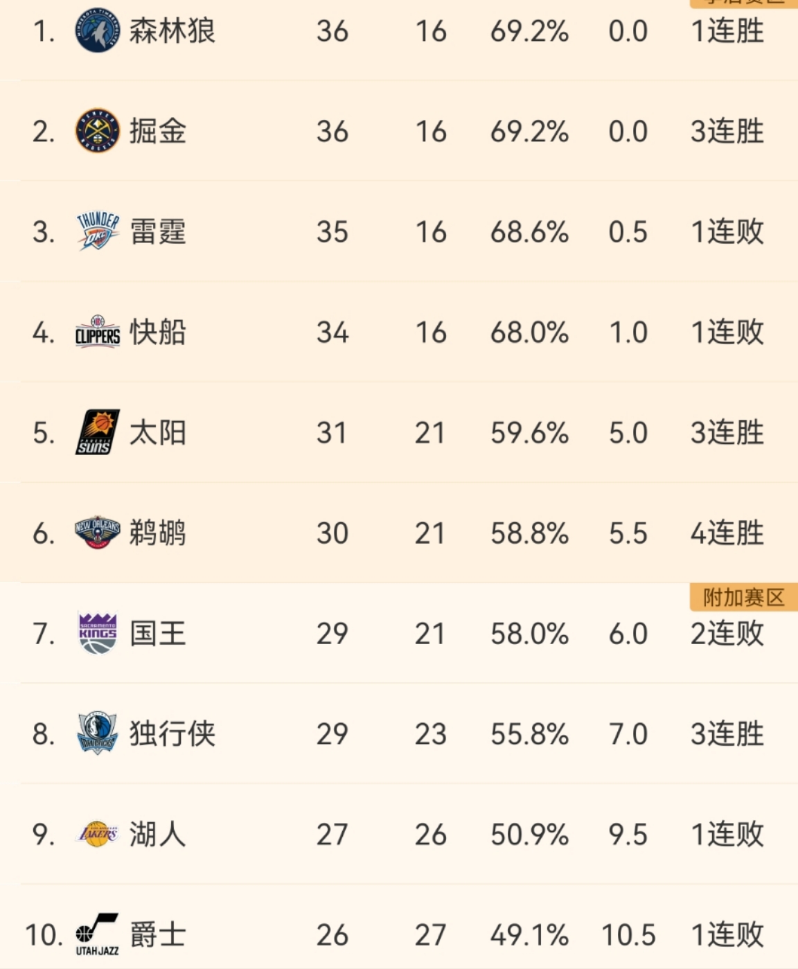 排名第一,森林狼,战绩36胜16负,球队近期的竞技状态火热,还击败了士气正盛的密尔沃基雄鹿。爱德华兹依旧保持高水平的发挥,这个赛季,他的进步速度令人瞠目结舌,特别是自主的进攻能力,如果还能提升组织这一块,上限也将更上一层楼。排名第二,掘金,战绩36胜16负,吃饭睡觉打湖人,球队近期更是迎来了一波三连胜。约基奇仍是联盟最具有统治力的球员,而小波特的状态也有所回暖 。