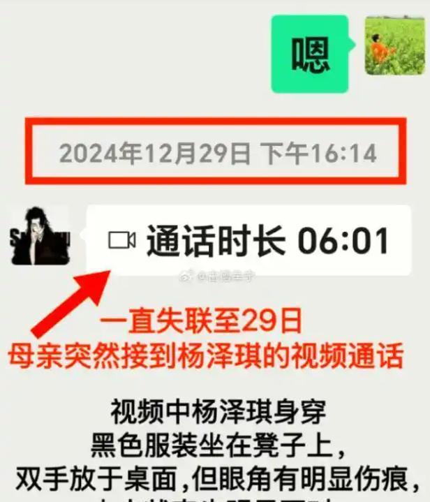 12月20日凌晨0:57分,杨泽琪到达大兴机场候机,怀揣着对异国之旅的憧憬飞向泰国。起初,没有丝毫异样,他还像往常一样和朋友愉快地聊天互动。可是到了换车之后,他就如同人间蒸发了一般,彻底没了消息。朋友和家人刚开始都没太在意,还以为是工作忙碌导致的,毕竟在这个快节奏的社会,这种情况也比较常见。然而到了12月29日,杨泽琪母亲接到的那个视频电话,就像一道晴天霹雳。视频里儿子眼角的伤痕触目惊心,整个人状态极差,穿着黑色衣服坐在凳子上一言不发。这画面就像一块巨石压在了家人和朋友们的心头,大家都意识到事情不妙。