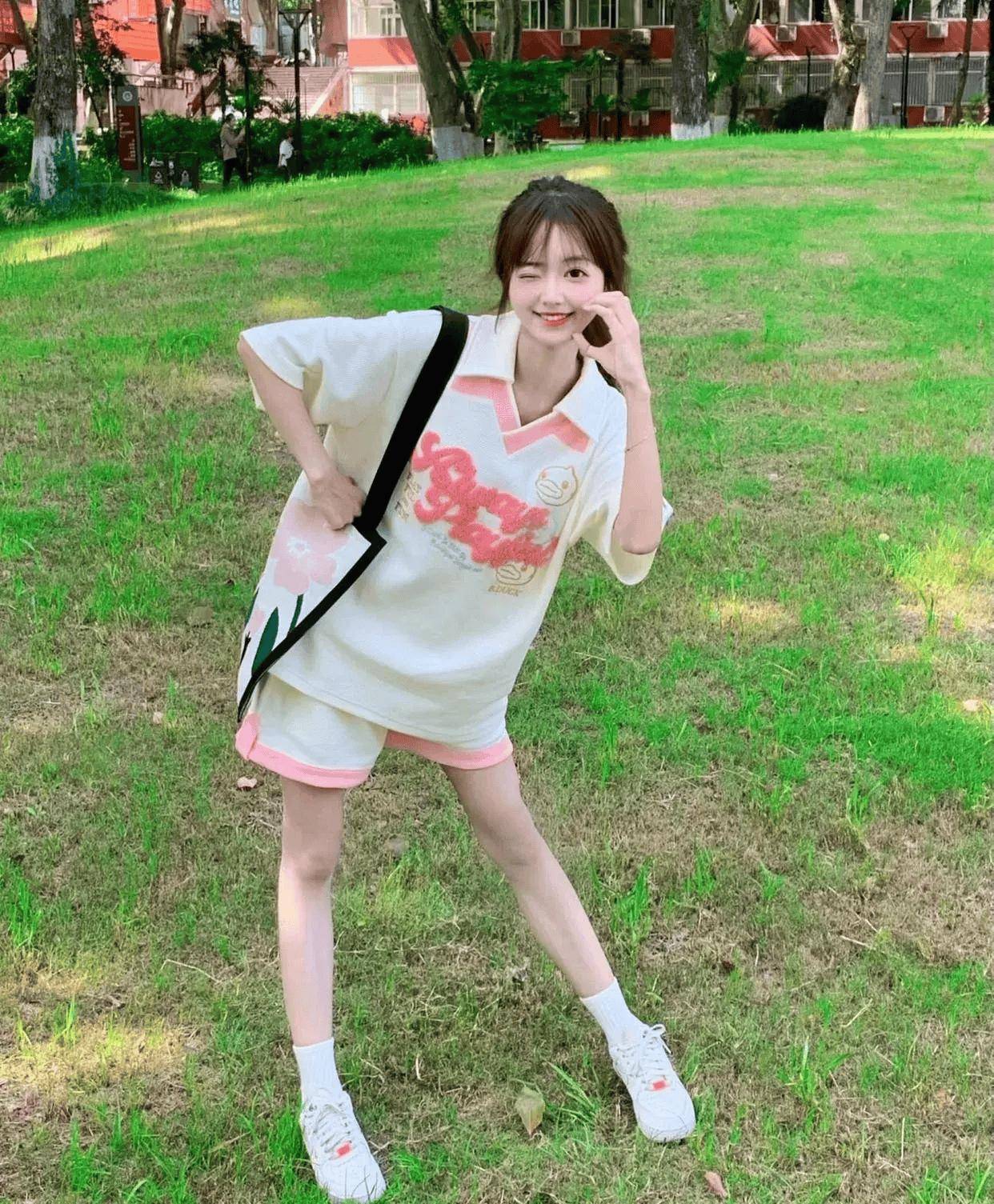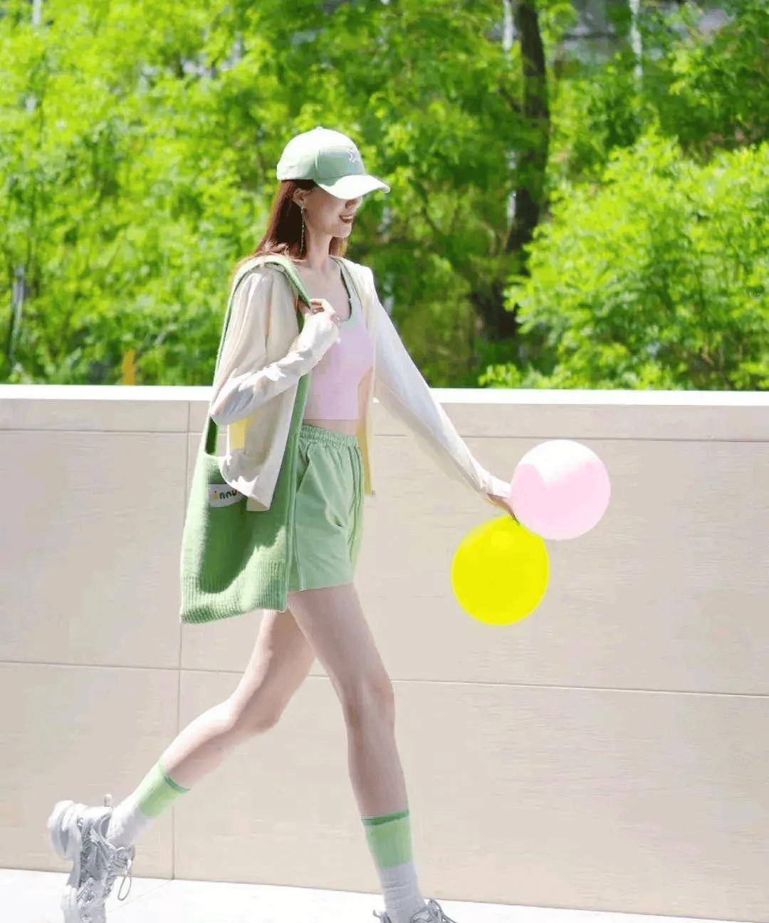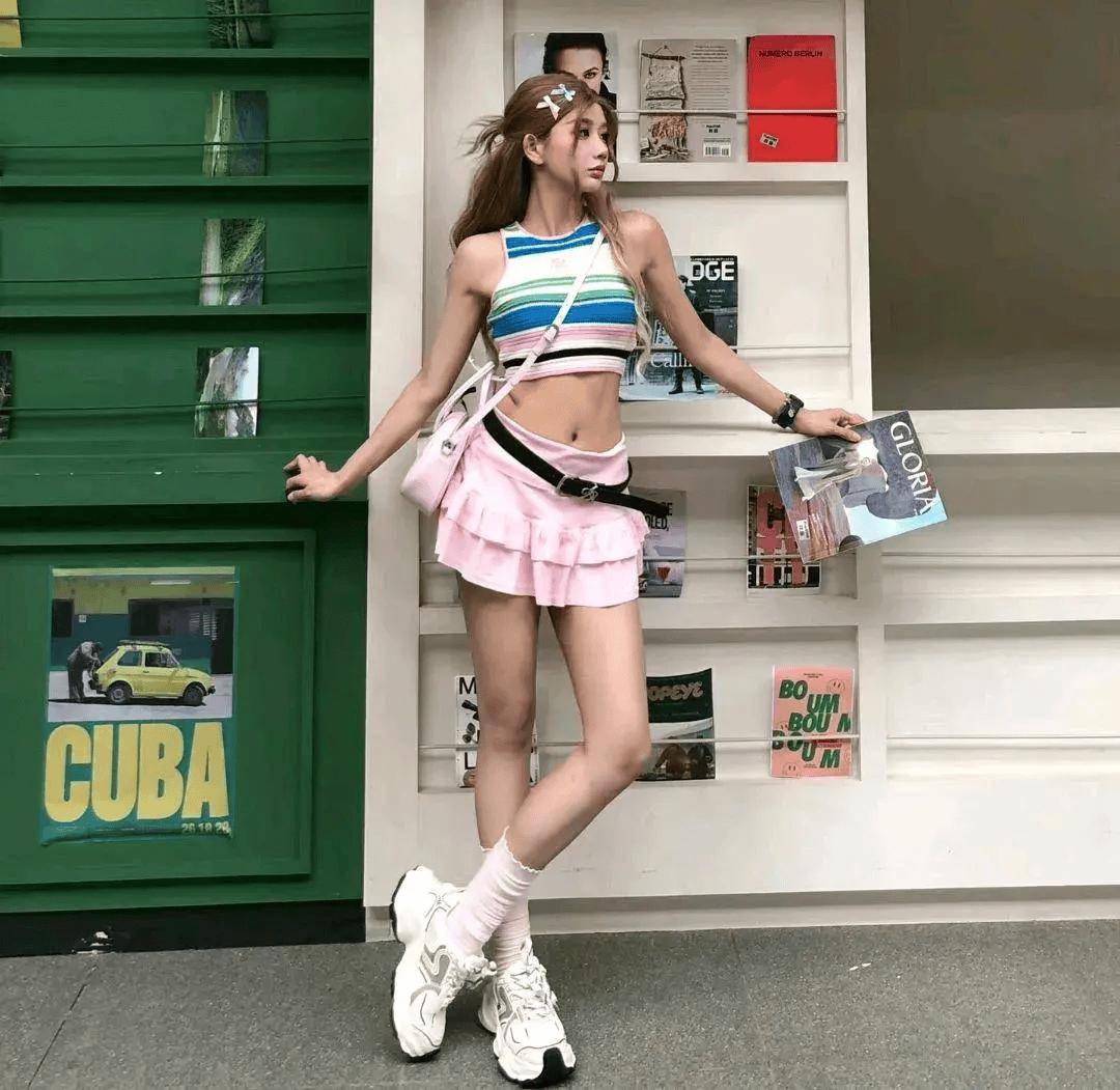 好喜欢这一身粉粉颜色的搭配,看起来整个人的心情都很好。背心配短裙,再加上一双运动鞋,小个子女生也可以轻易驾驭的穿搭,充满活力气息,又不失少女范。