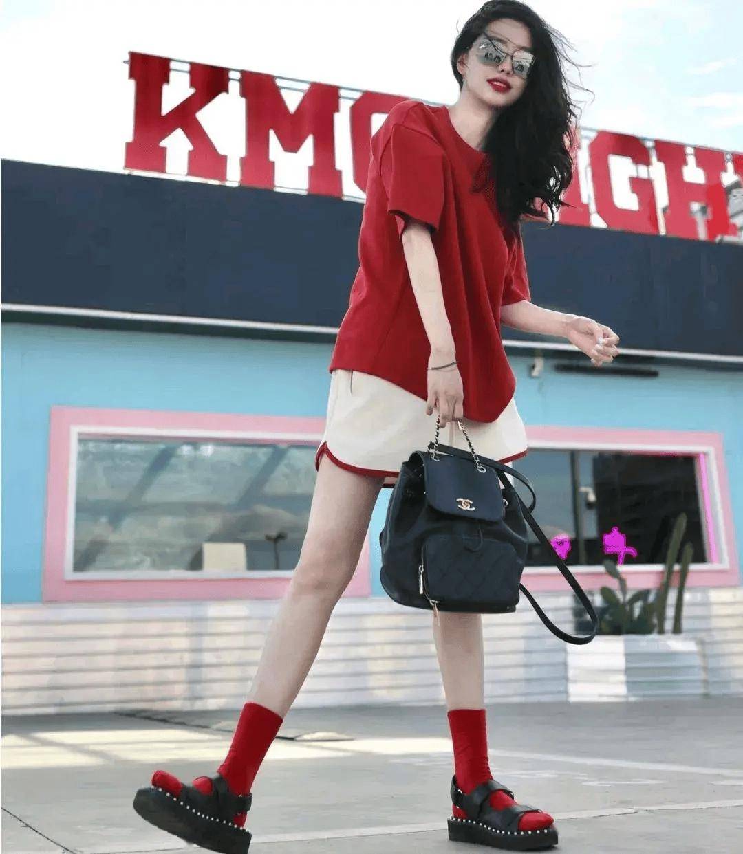 红色t 恤+白色短裤,慵懒随意范十足,腿部比例好的姐妹,就可以试试这样穿。