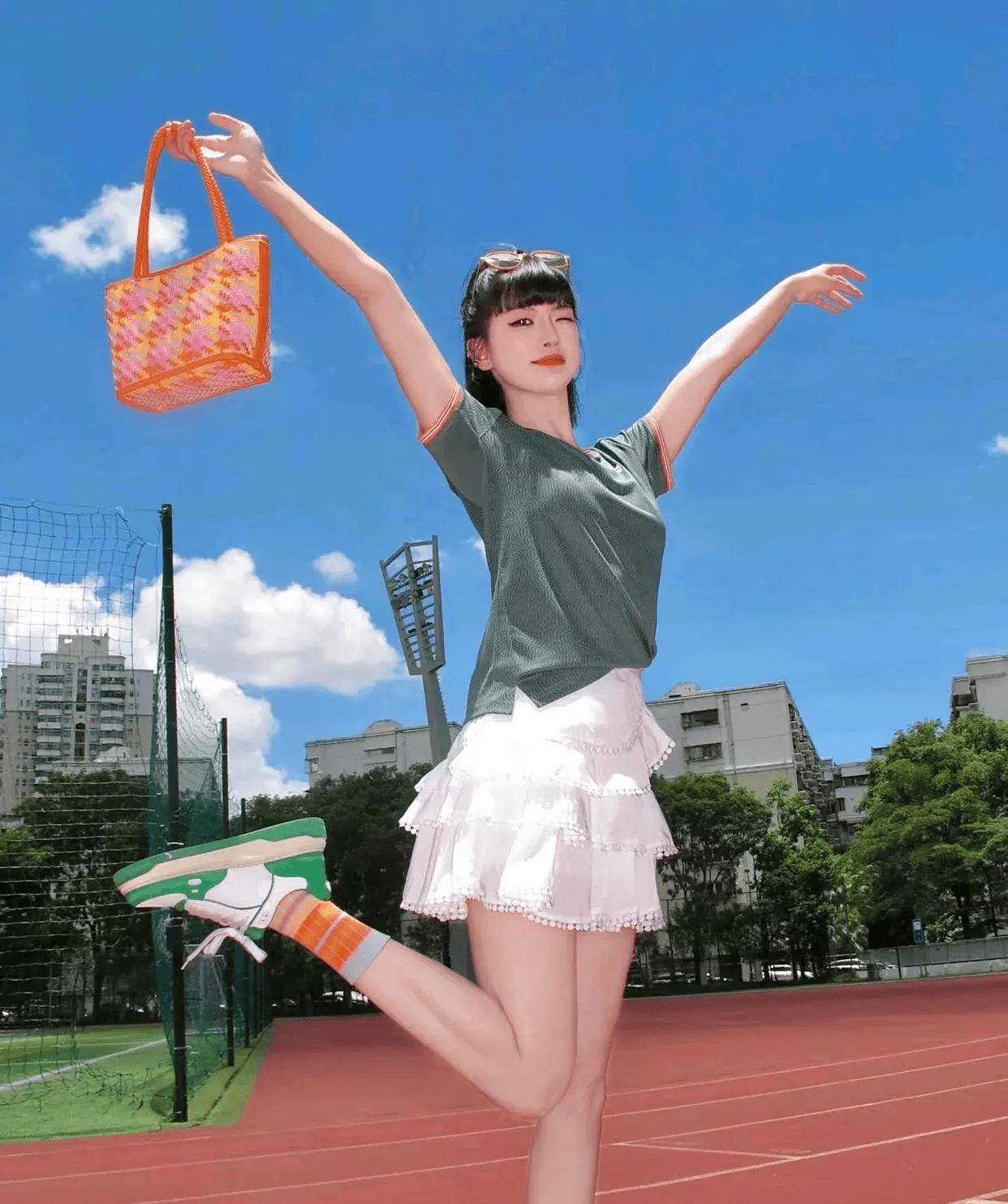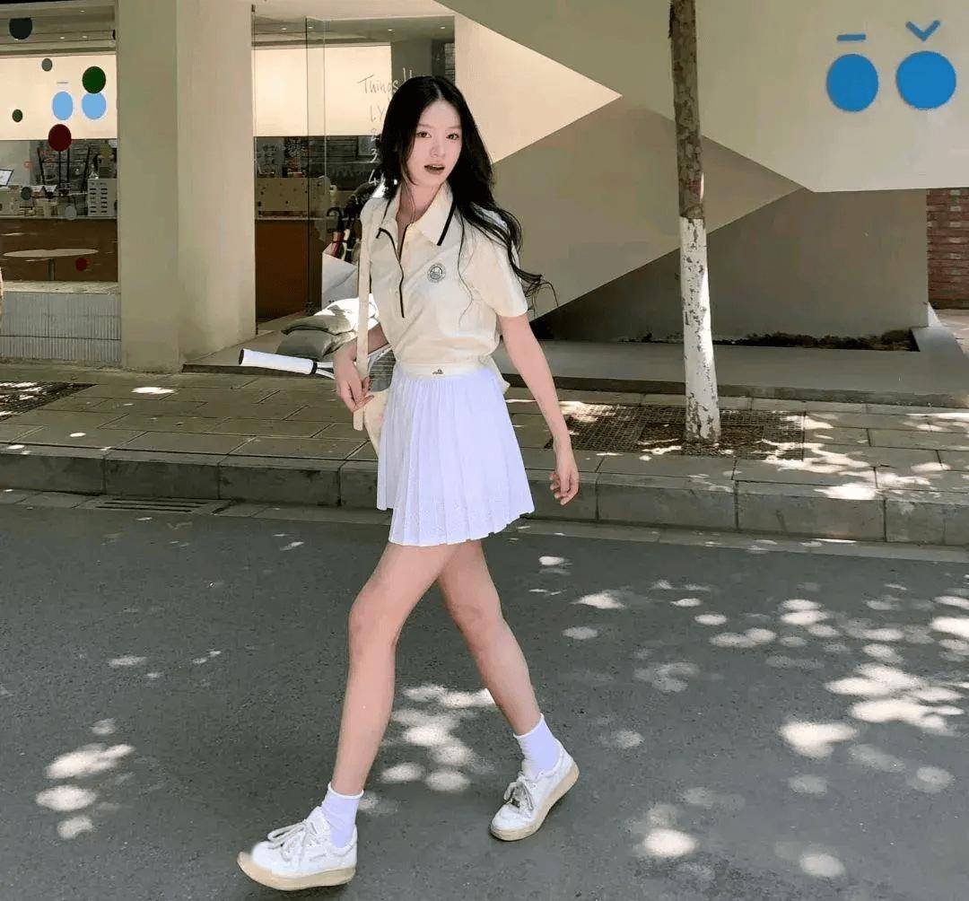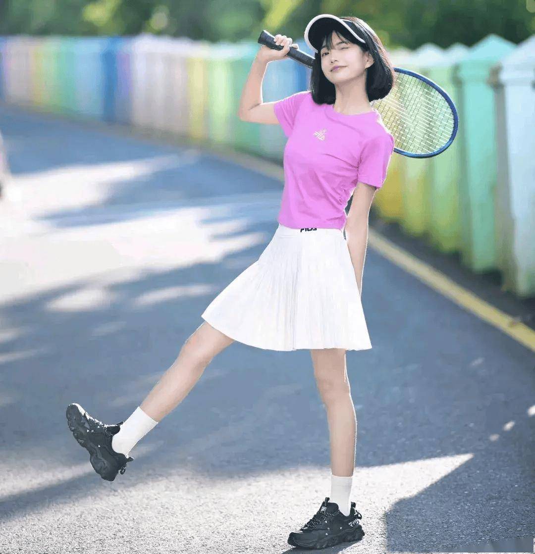 现在天气这么好,就约上自己好友一起去户外运动吧,多晒晒太阳,多运动一下心情才更好。粉色短袖t 恤和白色百褶半裙,加上一双黑色运动鞋,一整个青春感十足。
