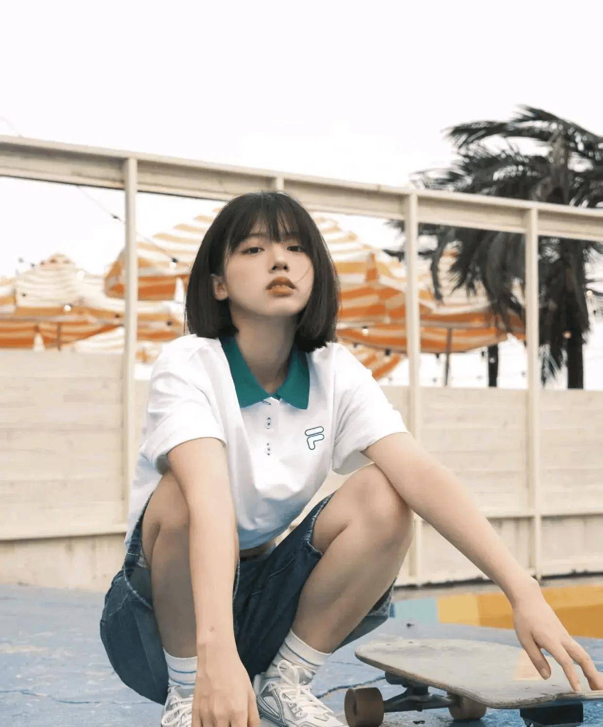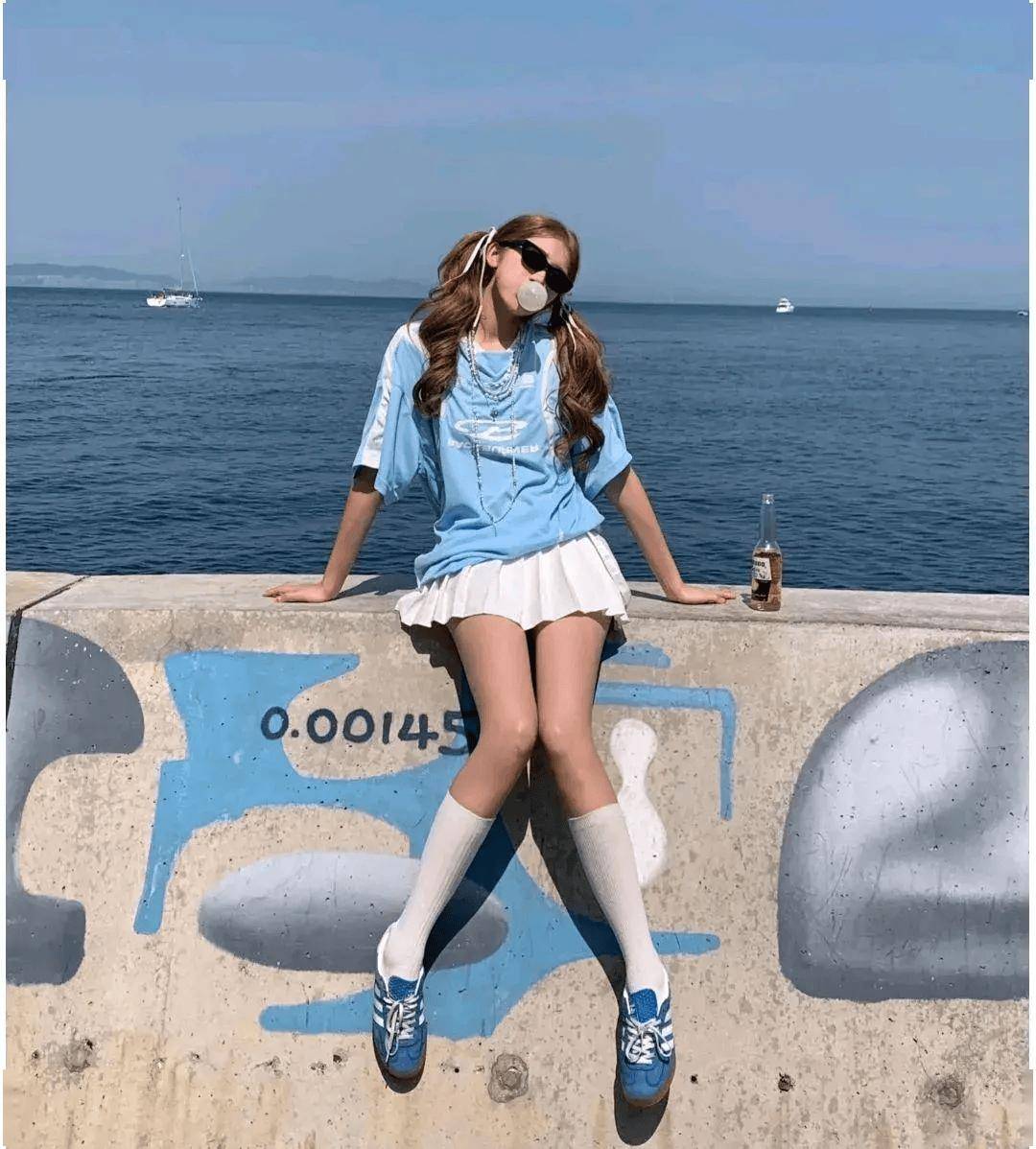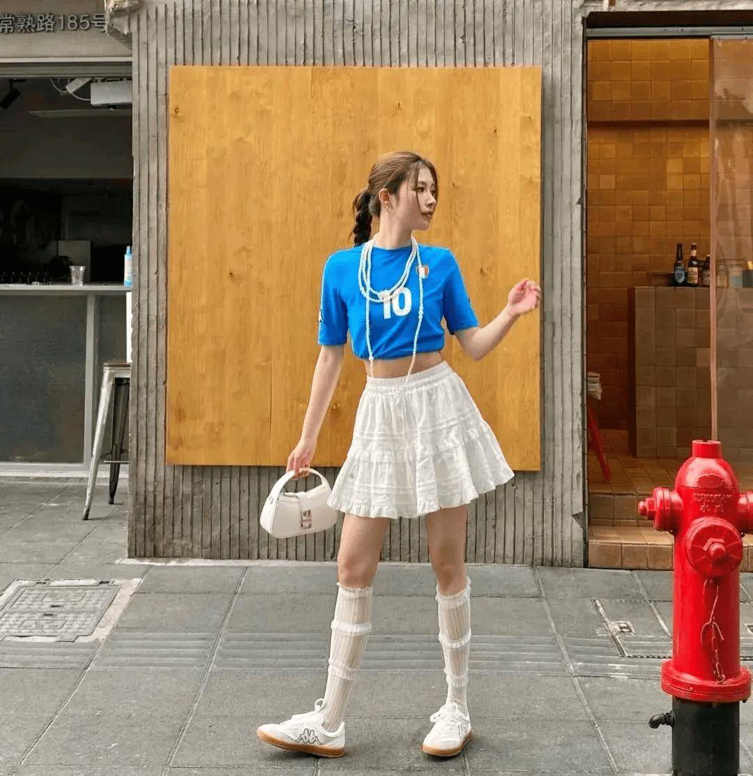 蓝色球衣和白色半身裙的碰撞,再搭配一双运动鞋,运动风与鬼马少女风的混搭,复古又不失休闲。