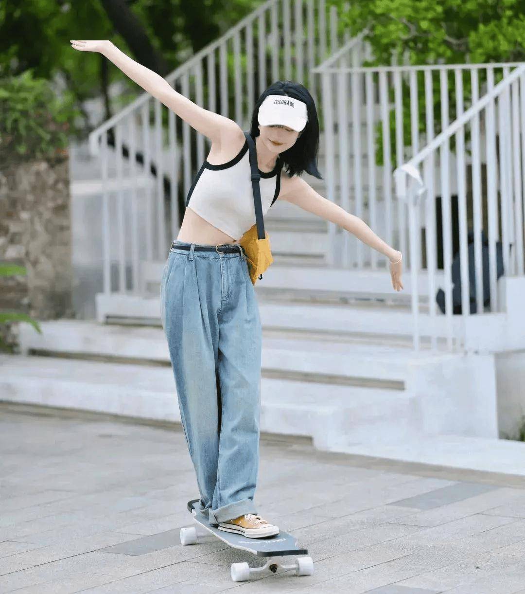 小背心配牛仔裤,这种甜酷风十足的运动风穿搭,任谁看了都会很喜欢吧?当然了,上身比例好的姐妹,就可以肆意点,若是你对自己的身材没有信心的话,那么就外搭一件防晒衫吧,既可以防晒又时髦。