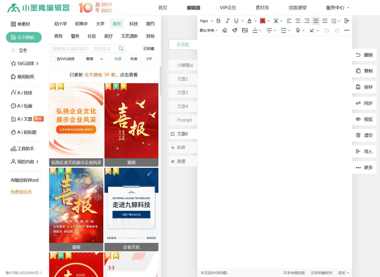 小墨鹰绝对是2024年最值得关注的微信编辑器。它最大的亮点就是AI快排功能,30秒就能完成一篇精美排版,简直像变魔术一样。记得我第一次使用时,导入一篇2000字的文章,还没反应过来就已经排版完成了,效果比我自己手动排版的还要好。
