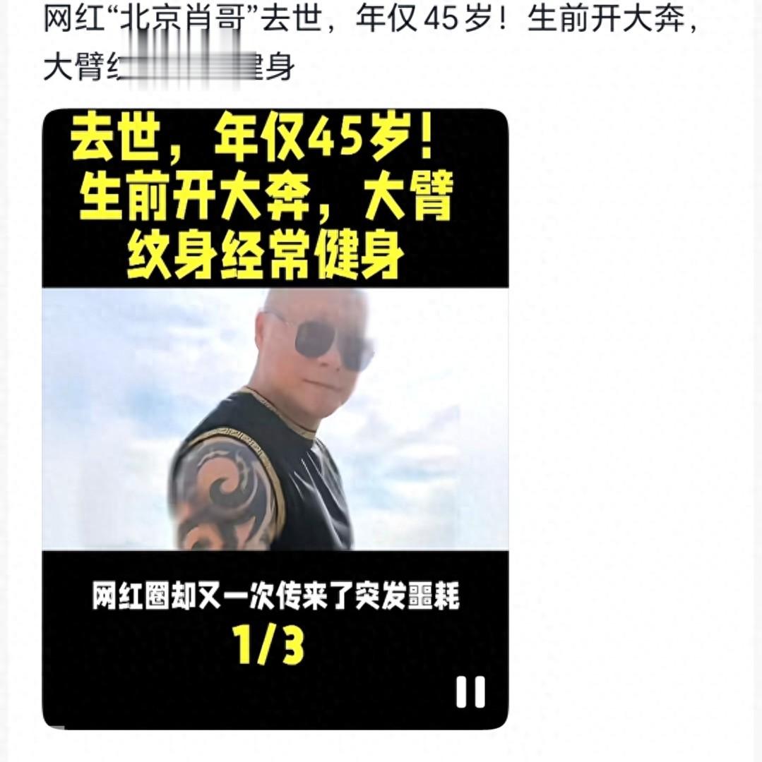 12月29日,有网友在平台上发布了一条消息,说是北京的一位网红“北京肖哥”去世了,年仅45岁,生前开大奔,家里玉石成堆,十几套房子出租,妥妥的一位北京玩家。