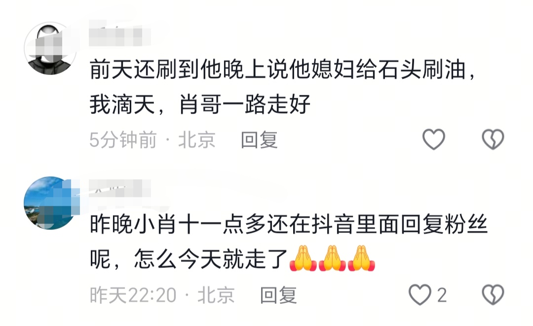 网友们也是觉得非常惋惜,前天还刷到肖哥晚上说媳妇给石头刷油,怎么就突然离开呢?