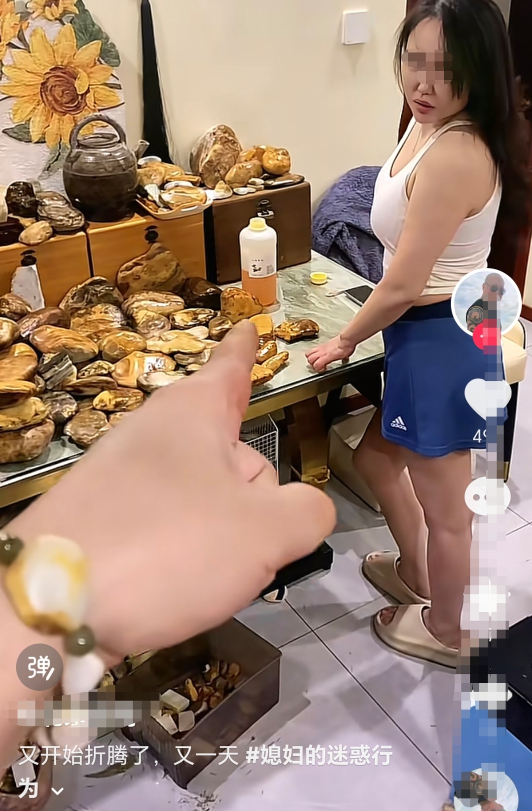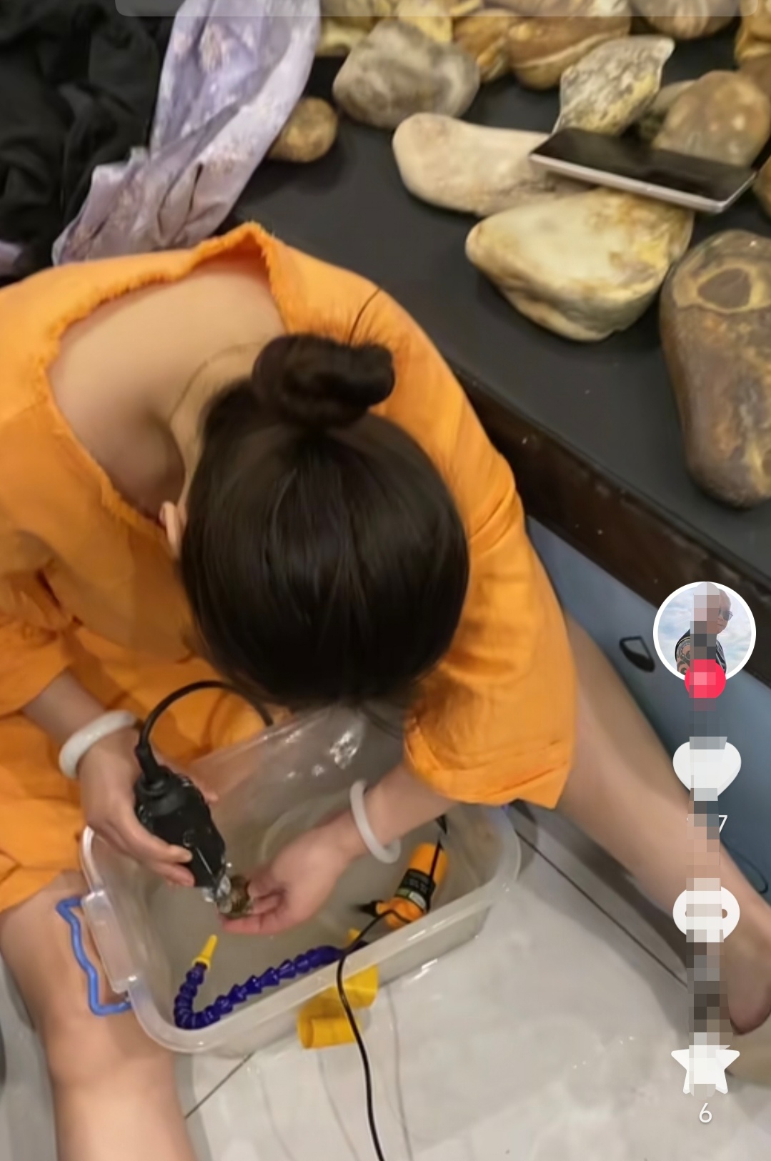 通过视频可以看到,肖哥家里的桌子上摆满了一堆的玉石原石,大晚上的妻子还在给它们刷油,目的就是看起来油润有光泽,不至于干巴巴的,这样卖起来能有个好价钱。