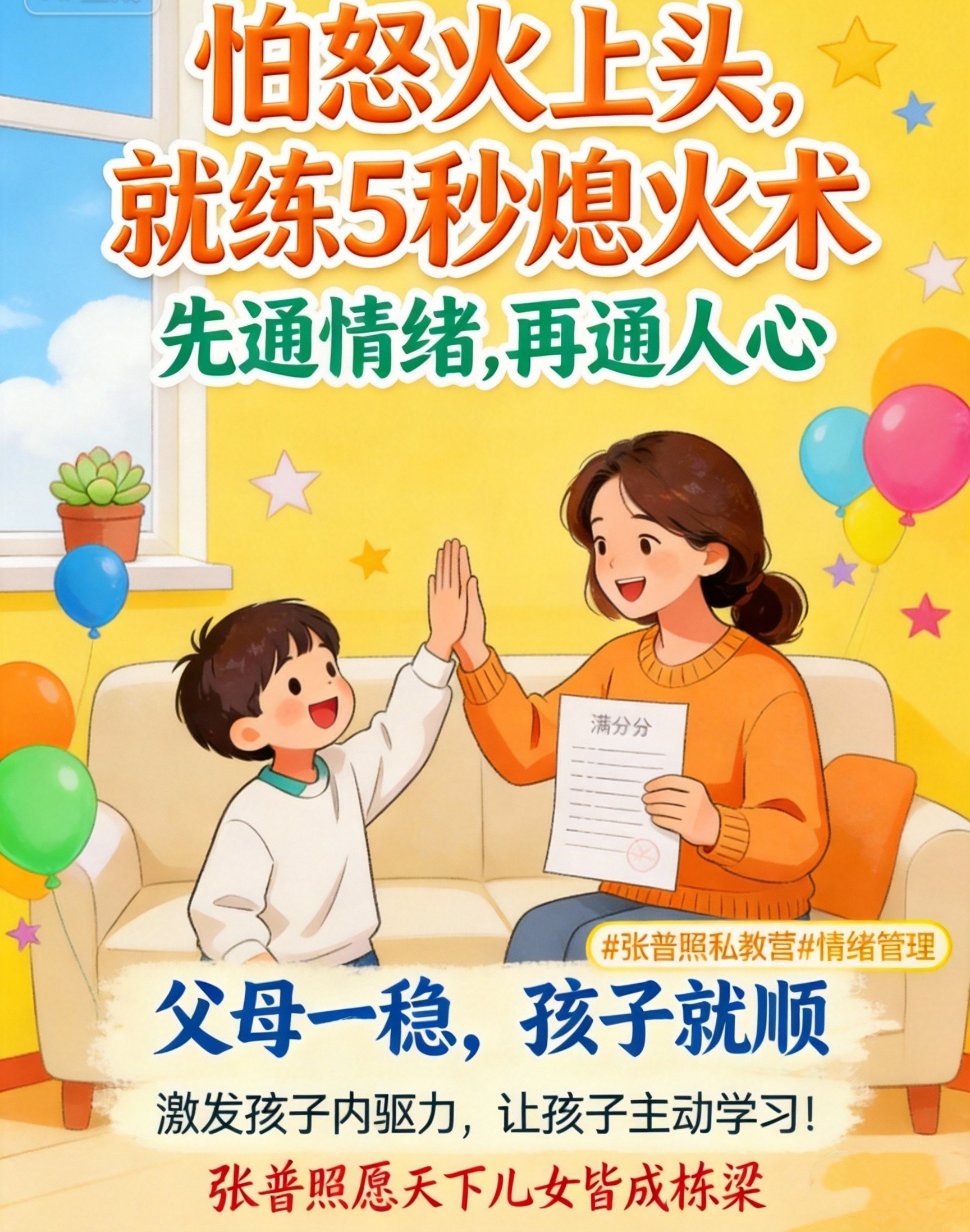 练习张普照5秒熄火术之后:你心里没有火,只有平静。你能平和地提醒,甚至微笑等待。神奇的是,当你不再用怒火催逼,孩子反而能静下心来,自己思考,自己管理时间。他会主动规划作业,会和你商量手机使用,家庭氛围从令人窒息的“战场”,变成了温暖合作的“静心岛”。这一切的转变,只源于你在情绪爆发前,练习了那救命的5秒。 现在就开始练第一次,你会体验到什么是“豁然开朗”和“如释重负”。
